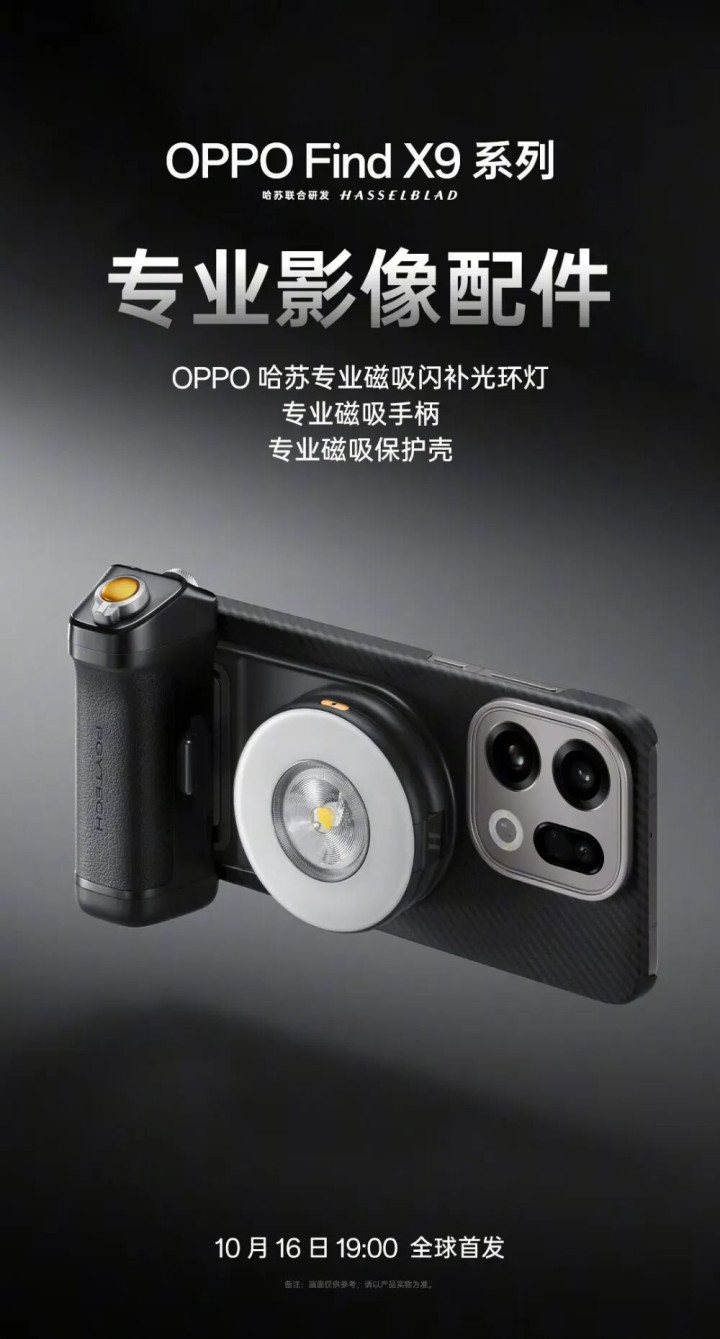 另外,OPPO还在今天公布了OPPO Find X9系列专业影像配件,全新磁吸手柄、专业磁吸保护壳,还有行业首款手机磁吸闪光外设 ——OPPO 哈苏专业磁吸闪补光环灯。
