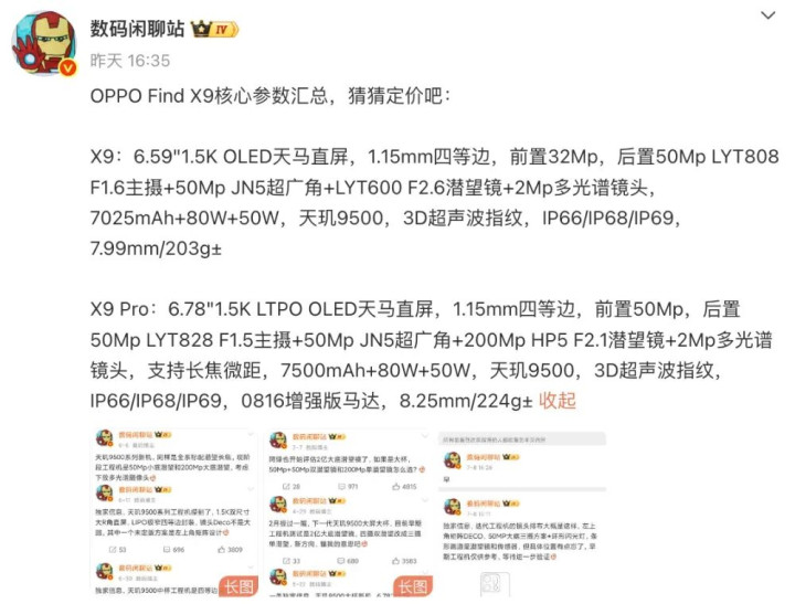 其他细节部分,OPPO Find X9机身厚7.99mm、重203g±,支持IP66/IP68/IP69。
