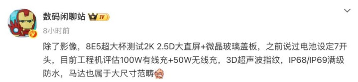 今天,博主@数码闲聊站 的一份爆料中提到,除了影像,8E5超大杯测试2K 2.5D大直屏、微晶玻璃盖板,电池设定7000mAh以上,目前工程机评估100W有线充和50W无线充,还有3D超声波指纹、IP68/IP69满级防水,马达也属于大尺寸范畴。