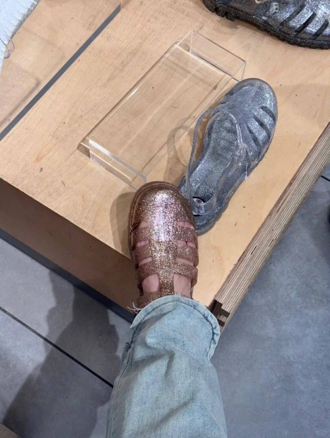 现在比较流行这种果冻水晶鞋,虽然很懂少女性吸引了一大批粉丝,通透如水晶的鞋面阳光一照虽然好看,但是也会有一种难闻的塑料异味,