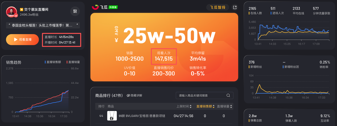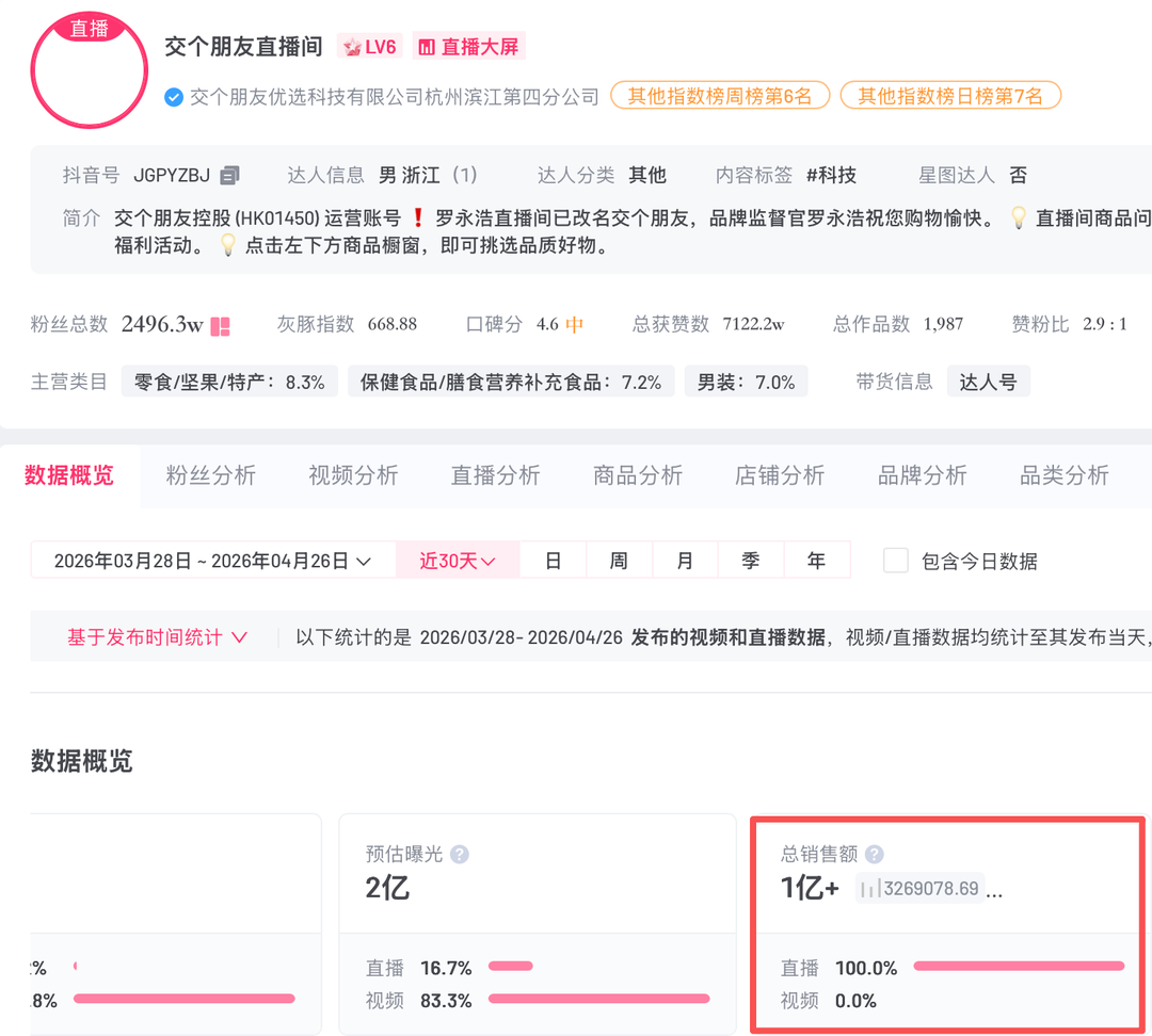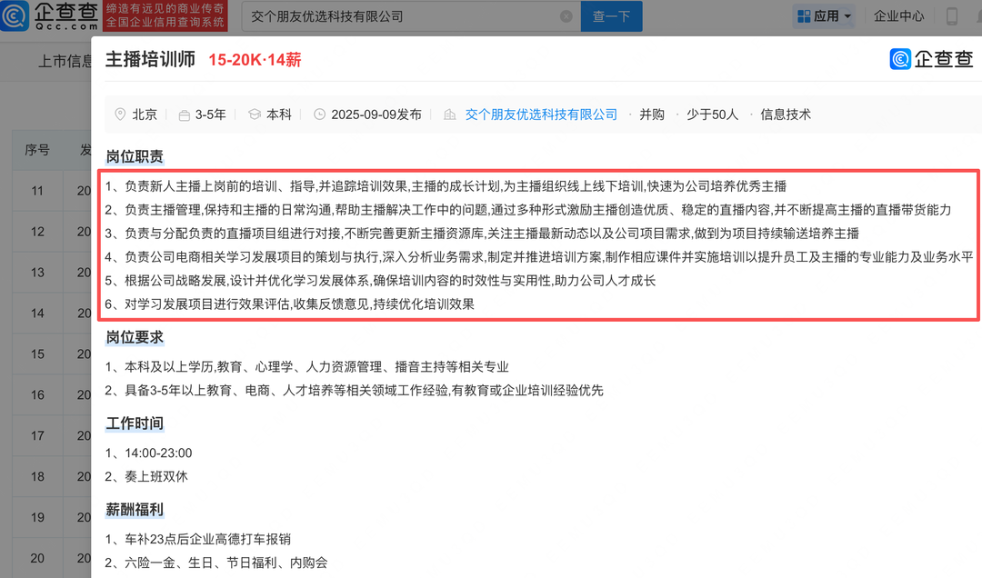 经查询,第三方平台信息显示,罗永浩交个朋友直播间开播4小时观看人次超14万,直播销售额25万至50万,近30天该直播间销售额过亿元。另据企查查APP显示,交个朋友优选科技有限公司现存续22家分支机构,其曾发布主播培训师职位招聘信息,要求负责新人主播岗前培训,快速为公司培养优秀主播,并不断提高主播的直播带货能力等,招聘薪资为1.5万至2万元。