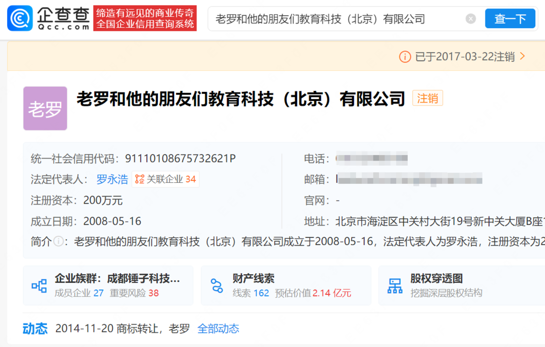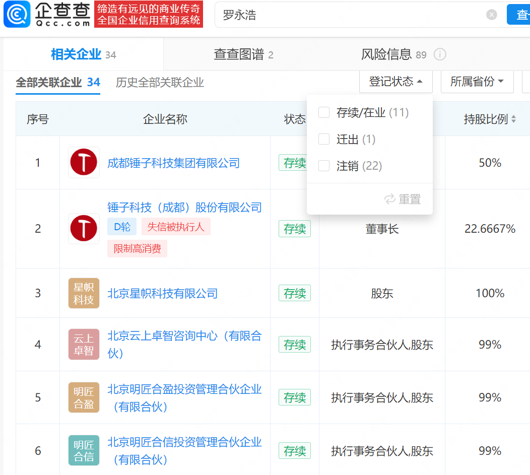 企查查APP显示,罗永浩离职后曾成立老罗和他的朋友们教育科技(北京)有限公司,该公司目前已注销。其名下现关联34家公司,其中11家存续,包括成都锤子科技集团有限公司、北京明匠合盈投资管理合伙企业(有限合伙)等,涉足教育、科技、投资管理等多个领域,其在上述公司任董事长、经理等职务。